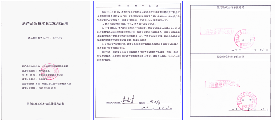 2013年5月,由黑龍江省工信委科技處組織,對USP-M系列超聲波除垢裝置進行了新產品鑒定,鑒定結論:“屬國內外首創,其技術水平達到國內領先”。