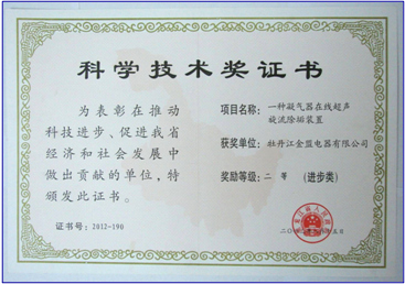 2010年,“一種凝汽器在線超聲波旋流除垢裝置”在電力系統200MW機組凝汽安裝使用,填補了國內空白,該項目2012年獲得黑龍江省人民政府 “科學技術二等獎”,2013年,獲得國內“首臺套獎勵”。